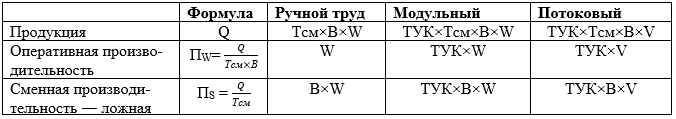 ПW = ТУК × W. В СССР и сейчас для планирования производства применяется оперативное нормирование труда, однако развитие экономики предприятий, рабочих мест осуществляется в отрыве от нормирования на основе показателя сменная производительность, по формуле: ПS=
