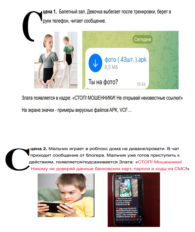 Первым этапом стала разработка сценария для видеоролика основных видов финансового мошенничества с детьми. Получились реальные кейсы, в которых мои сверстники оказались непосредственными участниками. Выдержка из сценария представлена на рис.2.