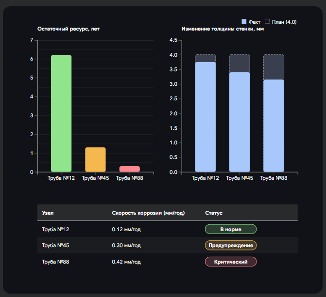 В таблице 1 представлены демонстрационные расчетные данные, которые обрабатывает и визуализирует платформа на примере условного аппарата. Система автоматически маркирует узлы, чей ресурс приближается к критической отметке.