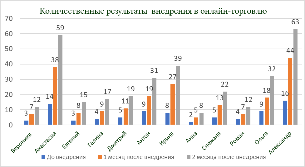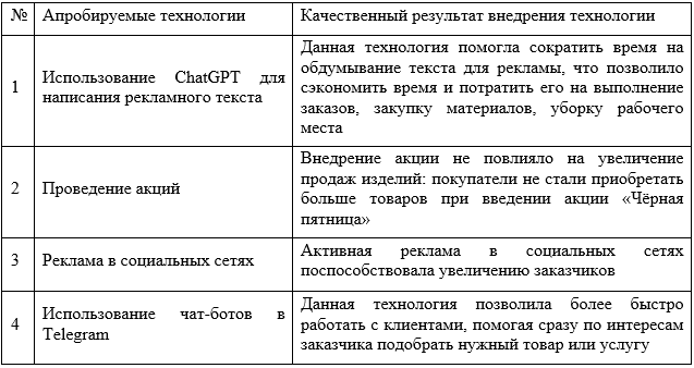 Первоначально производился отбор участников апробирования и информирование о способах применения цифровых технологий в сфере торговли. Далее поэтапно в течение двух месяцев внедрялись инструменты ИИ в области онлайн-продаж, по завершении апробирования была сделана аналитика эффективности продаж (см. таблицу 2). В процессе апробирования получилось охватить предпринимателей из разных городов, что свидетельствует об универсальности методов.
