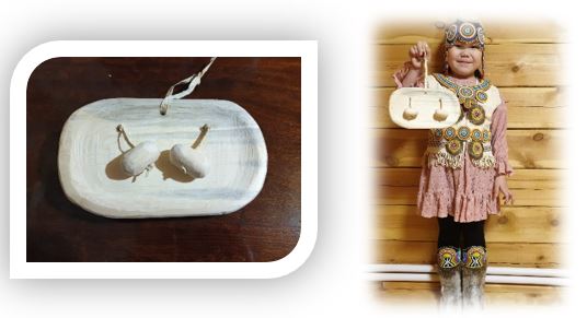 1. Хааҥылда оригинал. Плоское дерево овальной формы, лучше лиственница (твердое дерево) посередине более тонкой стенкой. Делают сквозное отверстие. Через эти отверстия пропускают кожаную веревку и привязывают деревянные шарики.