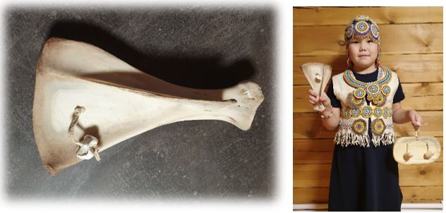 3. Лопатка. Берут старую, хорошо высохшую лопатку оленя и делают в центре сквозное отверстие. Через это отверстие пропускают кожаную веревку и привязывают кости копыт. По словам оленеводов, при встряхивании очень напоминает голоса собак. Таким инструментом оленеводы всю ночь развлекались во время дежурства в стаде, извлекая интересные мелодии, а также отпугивали волков. Лопатка изначально предназначалась для гадания.