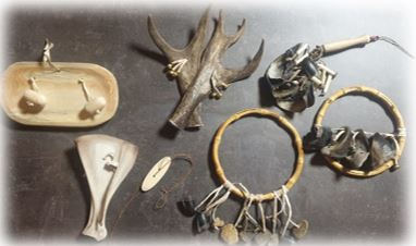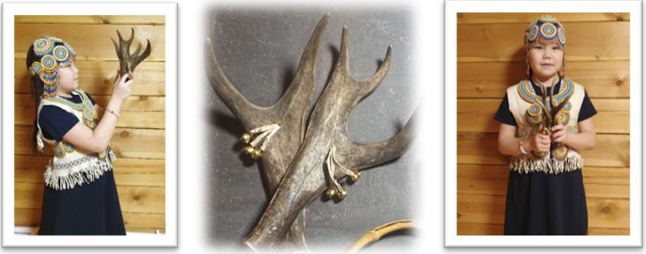 А) Копытца с колокольчиками. На тонкую веревочку из кожи нанизаны оленьи копытца и колокольчики. Эвены верили, что звон колокольчиков отпугивает нечистые силы. Колокольчики являются оберегом. Потому на упряжных оленях надевают колокольчики. Чудодейственную силу металлическим колокольчикам придавали и народы Мордвы, они вешали колокольчики на музыкальный инструмент – посох. Его использовали в различных ритуалах.