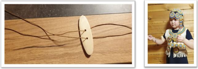 Гуделка - шумовой музыкальный инструмент, свободный аэрофон.[7] Представляет собой маленькую дощечку из дерева, кости и других материалов (я использовала дерево лиственница), сквозь щели с двух сторон продета прочная нить из оленьего сухожилия. В моем случае вместо сухожилий использовала капроновую нить. Это любимая игрушка детей. Хорошо развивает руки. При скручивании и закручивании петли дощечка начинает издавать звуки похожие на завывание ветра. Поэтому её называют «Песней (шум) ветра».