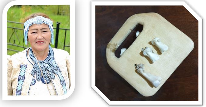 Моя бабушка, Степанова Людмила Афанасьевна, солистка эвенкийского ансамбля «Һокто». Хаанылда бабушки сделана из дерева, на которую прикрепили косточки. Это современный вид хаанылды, с которым бабушка выступает на концертах и праздниках.