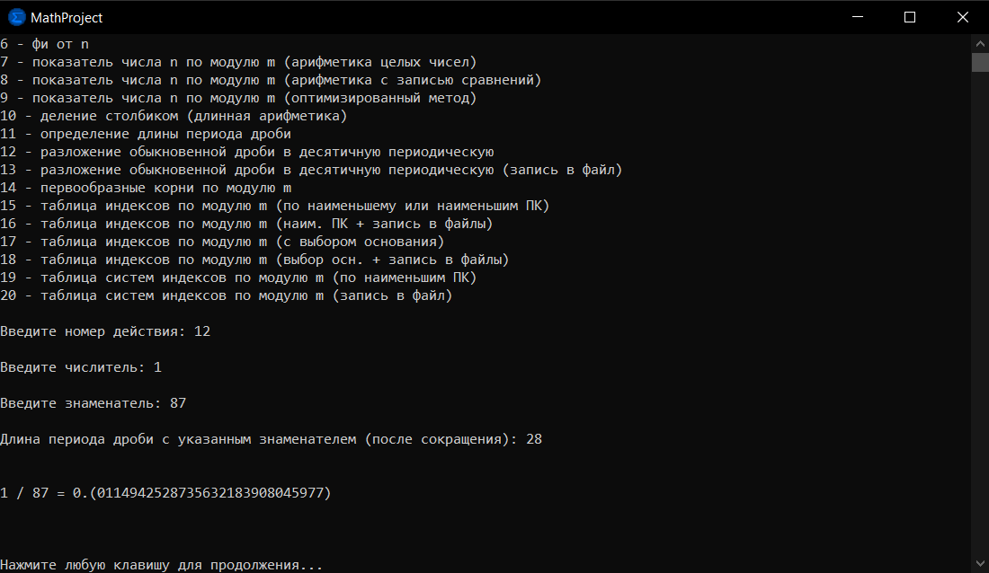Пример 1: переведём дробь в десятичную периодическую с помощью моей программы. Сначала, выберем номер действия — 12, а затем введём по очереди числитель и знаменатель. Далее сразу выведется разложение данной дроби в десятичную периодическую.