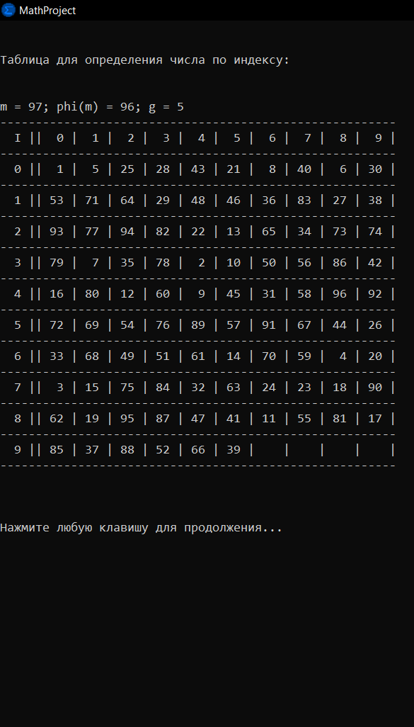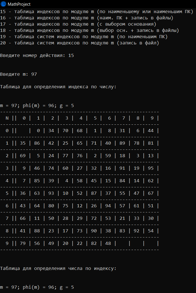 Пример 2: составим таблицу индексов по модулю 97 с помощью данного приложения. Выберем номер действия — 15. Далее введём значение m и таблица сразу будет построена.