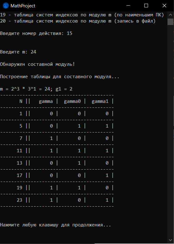 Пример 2: составим таблицу индексов по модулю 24 с помощью данного приложения. Выберем номер действия — 15. Далее так же введём значение m и таблица будет построена.